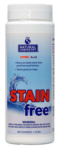 Stain Free – Removes Metal stains from pool liners and finishes, quickly removes stubborn stains. Your pool water must be balanced. Lower your chlorine to 1 ppm for the product to properly work. Do not shock the pool for one week after using the product. You may add bits of chlorine to keep the pool from growing algae after treatment, but no more than 2 ppm of chlorine.