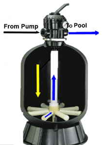 When your sand filter is on Filtration the water is pumped from the pool through the pump and then into the filter. The water will travel from the intake of the filter, through the filter media, where the debris will be caught, and then the water will go through the laterals, up the standpipe and back into the pool.