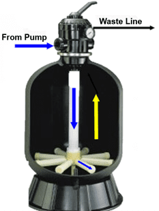 When backwashing the filter, the water comes in from the pump and down the standpipe which then pushes the water through the laterals and upwards through the filter media and takes it out the waste line, removing all the debris that the sand filter has caught previously.
