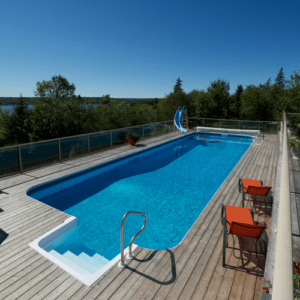 A lap pool is a swimming pool primarily built and used for fitness and health purposes. Lap pools are usually long and narrow, and ideally at least 45 feet in length (or width, depending on where you’re standing). Typically, lap pools are a rectangular shape. They are a good solution for narrow or shallow residential lots in which the homeowner desires a swimming pool to get frequent exercise in the privacy of his or her own backyard.