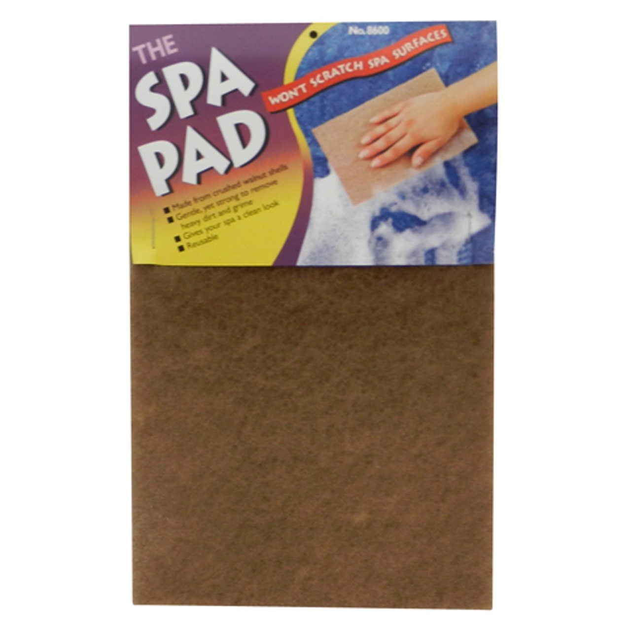 Spa pad used to clean the surface of your spa, while ensuring you won’t scratch spa surfaces. Made from crushed walnut shells, it is gentle yet strong enough to remove heavy dirt and grime. It is long lasting, reusable, and extremely easy to use. Make sure to do a test patch first to ensure it does not effect your hot tub acrylic.