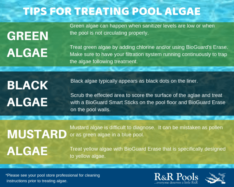 There are four chemical treatments that will inhibit or kill algae; chlorine (hypochlorous acid), quaternary ammonium compounds, polyquats and copper. Chlorine will disrupt the metabolic activity within algae cells and growth will not continue, even in nutrient-rich surroundings. Often, algaecides are only used as a corrective treatment, but an initial dose added at the start of each season, or whenever significant amounts of water are added, will prevent algae growth during the course of a season. The addition of an algaecide can also contribute to improved water quality.